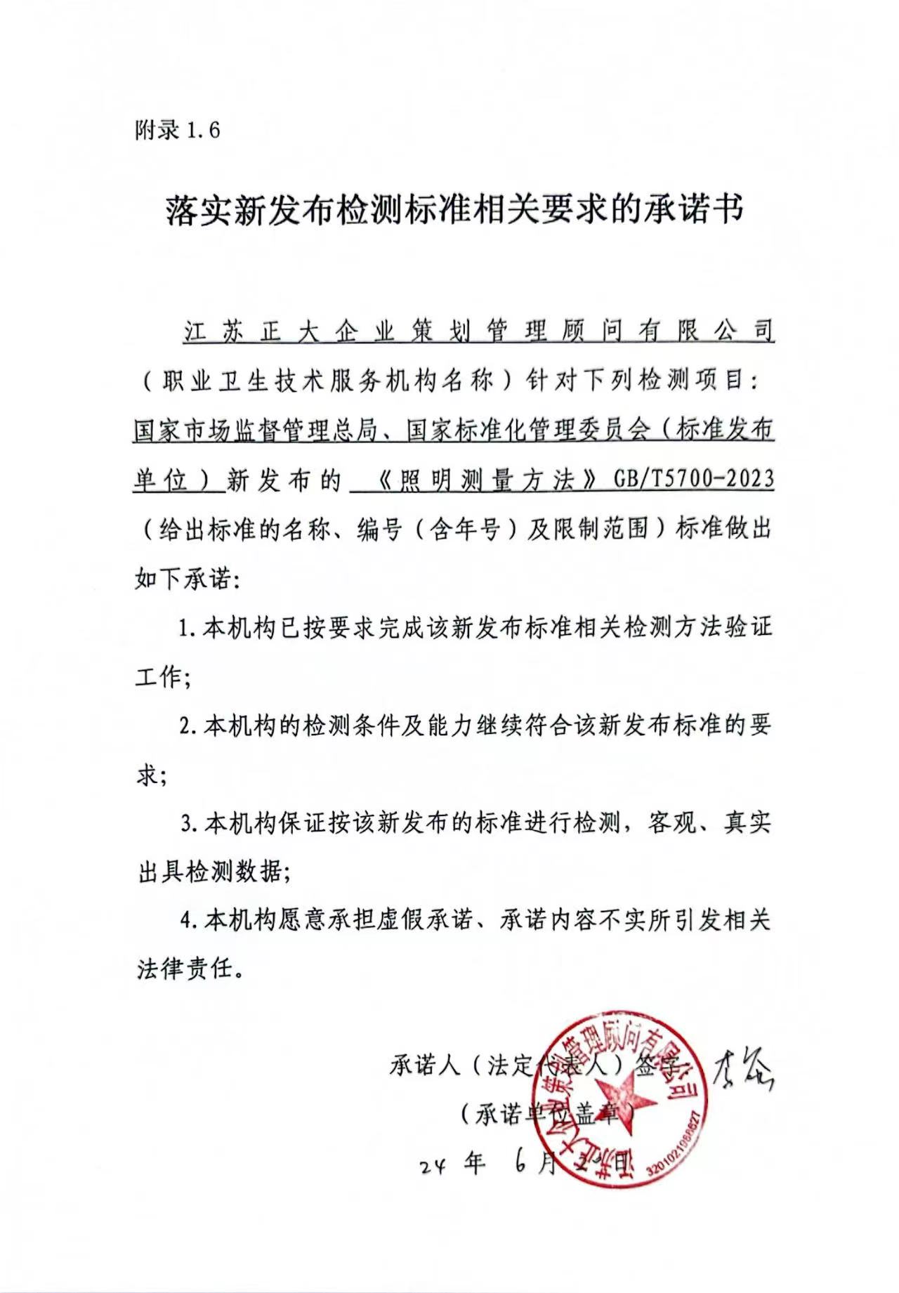 落實新發(fā)布檢測標準相關要求的承諾書