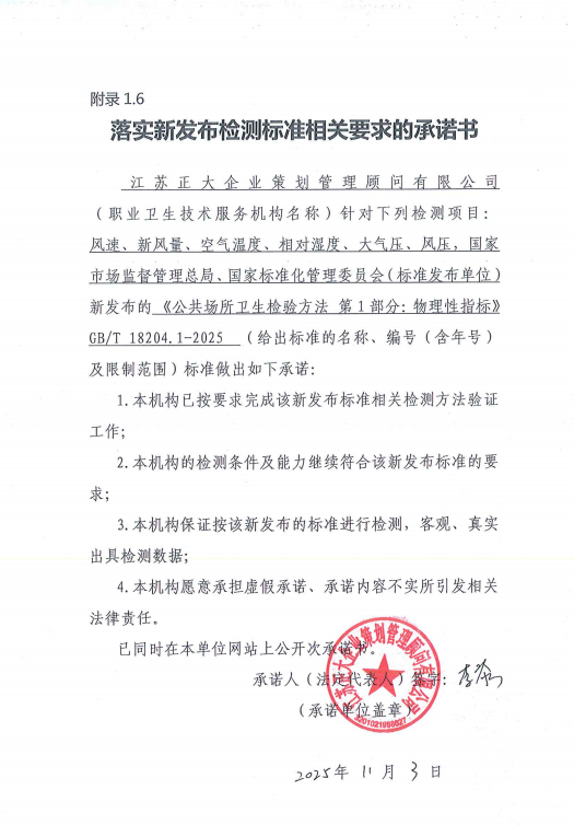 落實(shí)新發(fā)布檢測標(biāo)準(zhǔn)相關(guān)要求的承諾書